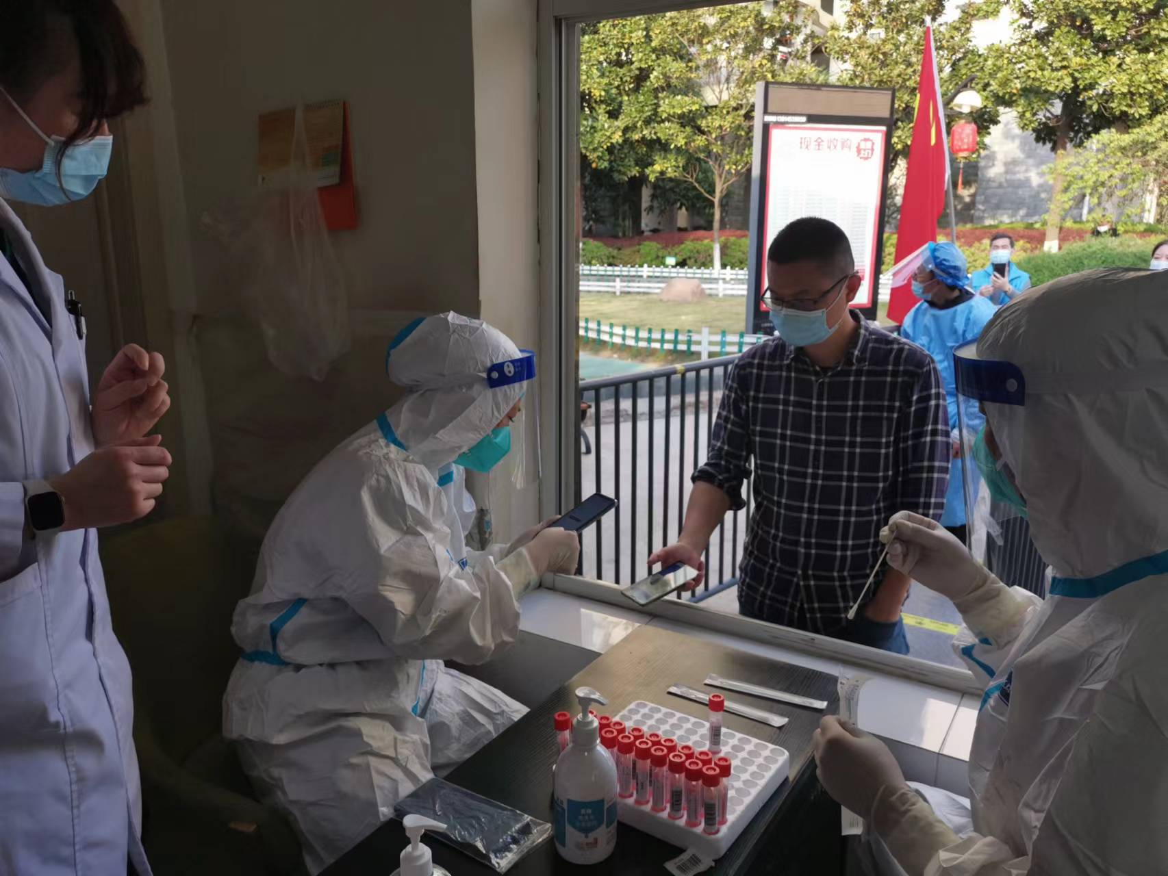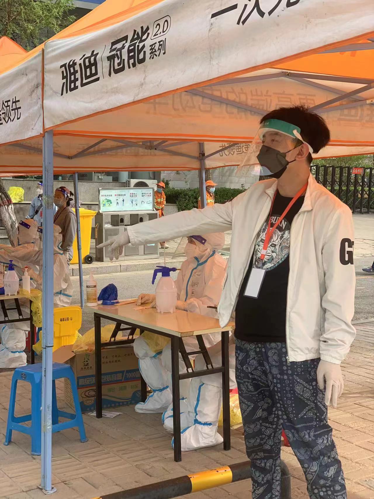 項目部經(jīng)理張麗華支援莫愁湖街道江東門(mén)社區的核酸采集,對每個(gè)前來(lái)做核酸的人員進(jìn)行信息登記及身份核實(shí)工作。
