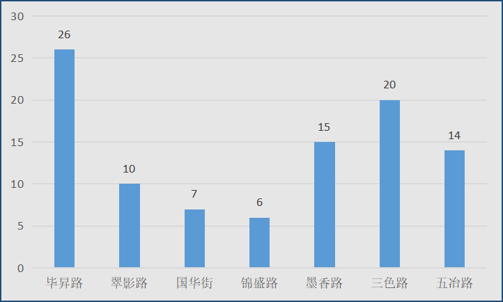 從案件采集區域看,本次專(zhuān)項整治活動(dòng)案件發(fā)生在交叉路口21條,以暴露垃圾和無(wú)照經(jīng)營(yíng)游商為主;道路上的案件量為98條,以畢昇路、三色路、五冶路為主,占總案件量的50%。
