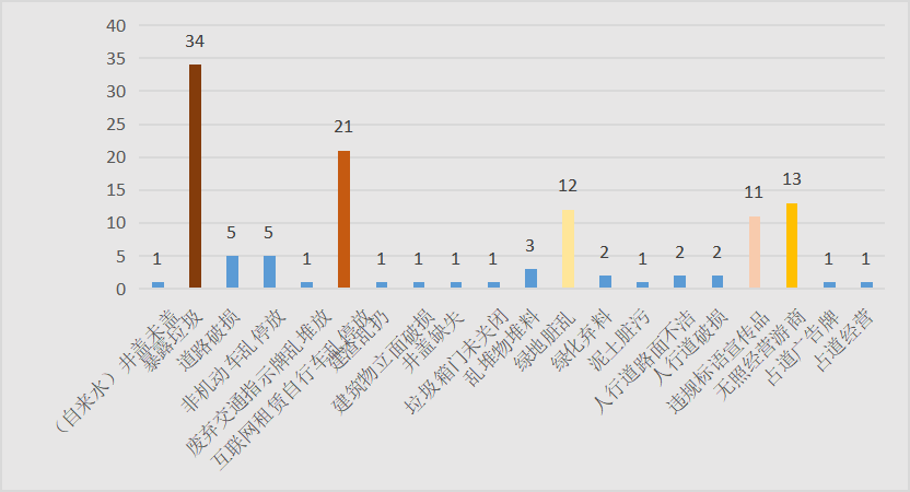 本次專(zhuān)項整治活動(dòng)共推送案件119件。涉及20多個(gè)類(lèi)別,高發(fā)問(wèn)題主要以暴露垃圾(34件)、互聯(lián)網(wǎng)租賃自行車(chē)亂停放(21件)、無(wú)照經(jīng)營(yíng)游商(13件)、綠地臟亂(12件)、違規標語(yǔ)宣傳品(11件)這五類(lèi)為主,占總推送案件量的77%。