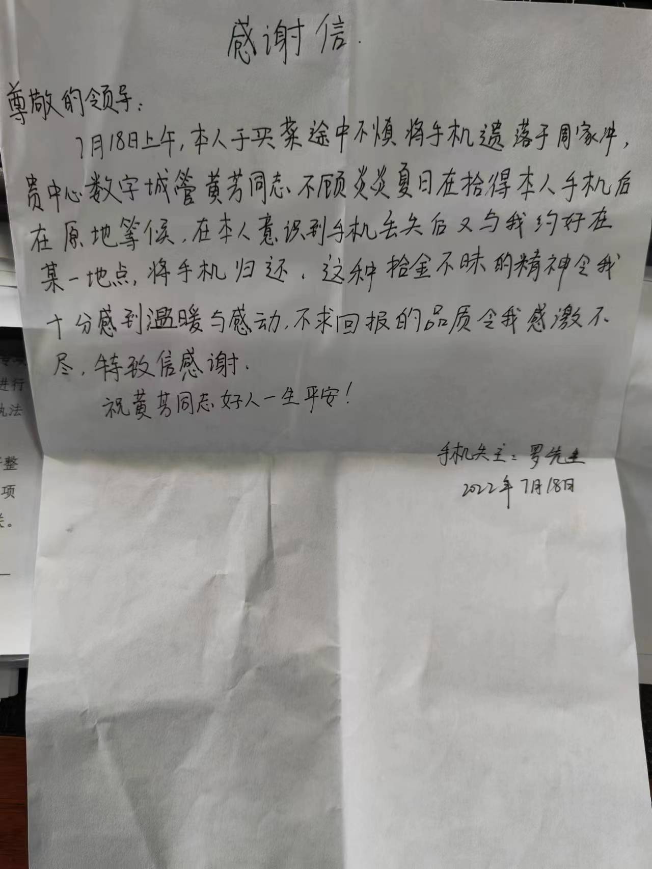 7月18日上午,本人于買(mǎi)菜途中不慎將手機遺落于周家沖,貴中心數字城管黃芳同志,不顧炎炎夏日在拾得本人手機后在原地等候,在本人意識到手機丟失后又與我約好在某一地點(diǎn),將手機歸還。這種抬金不昧的精神令我十分感到溫暖與感動(dòng),不求回報的品質(zhì)令我感激不盡,特致信感謝。